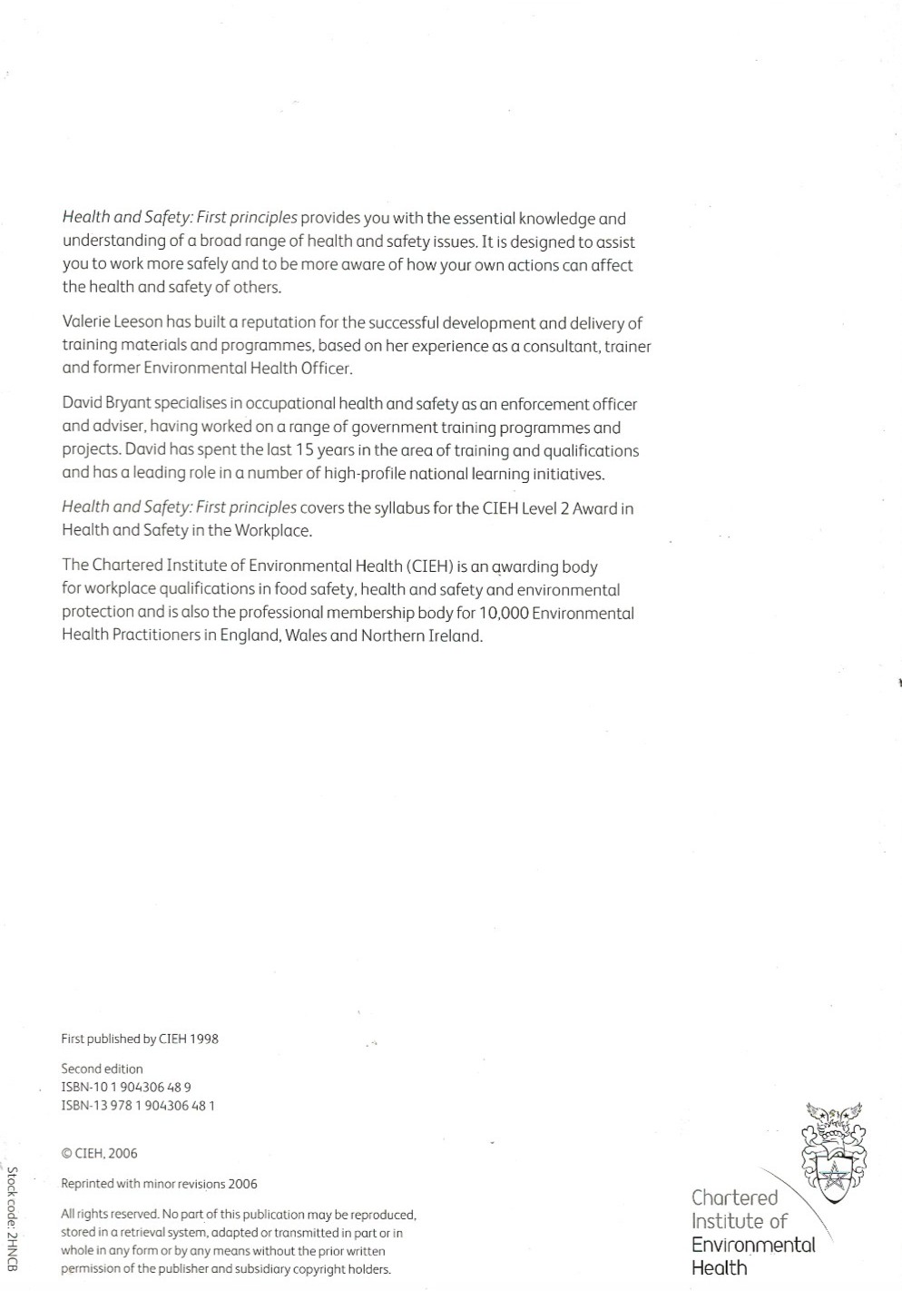 Health and Safety First Principles gives you essential knowledge and understanding of a wide range of health and safety issues. It is designed to help you work more safely and to increase your awareness of how your actions can impact the health and safety of others.